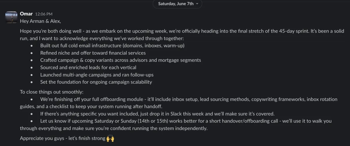Two partners from an email marketing agency, Arman & Alex, found one of our YouTube videos, binge-watched a few more, and booked a call. They were both top finance industry pros - smart, experienced, but stuck when it came to building an agency from scratch.