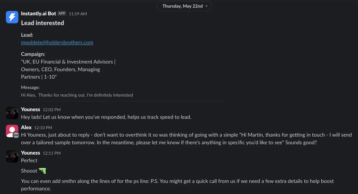 Integrated Slack notifications + 1-1 Communication + training on how to handle interested replies and convert them into booked calls